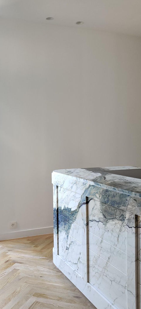 A deep appreciation for Brecchia Capraia marble defines the space, while treathing the material as a solid sculptural block as the kitchen island, becoming a striking natural centerpiece. Rather than a traditional kitchen setup, the design leans toward a bar-like display, elevating everyday use into an artful experience.